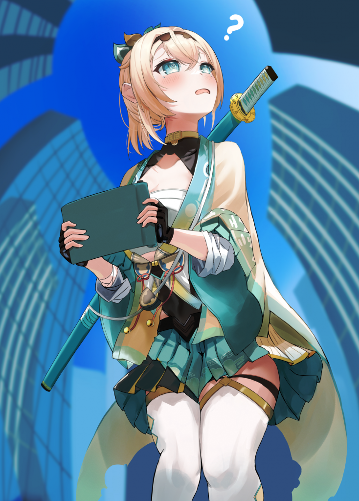 迷子中で知らない土地だとけっこう怖くなるイメージがあったので、周囲のビルを魚眼レンズで見たかのように歪ませ、いろはさんに覆いかぶさるような威圧感を出してみました。手に持っているのは一族に伝わる地図(巻物)だけど、古くてよく分からないみたいなイメージです。ご本人の「和」とビル街の「洋」の対比も意識しています。