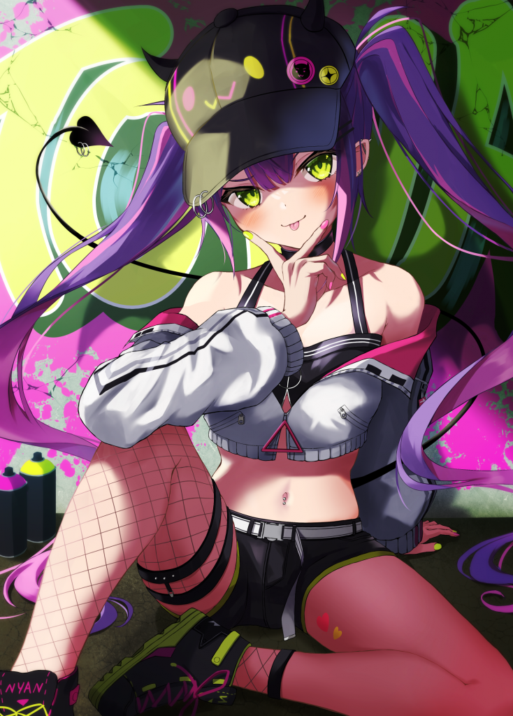 橋の下の壁にグラフィティーをスプレーで描き、悪魔的所業やってやった!とどや顔しているイメージで描きました。いたずらっぽく出した舌と、それを強調するV字の指がポイントです。また地べたに座り込んで、不良っぽさを出してみました。
