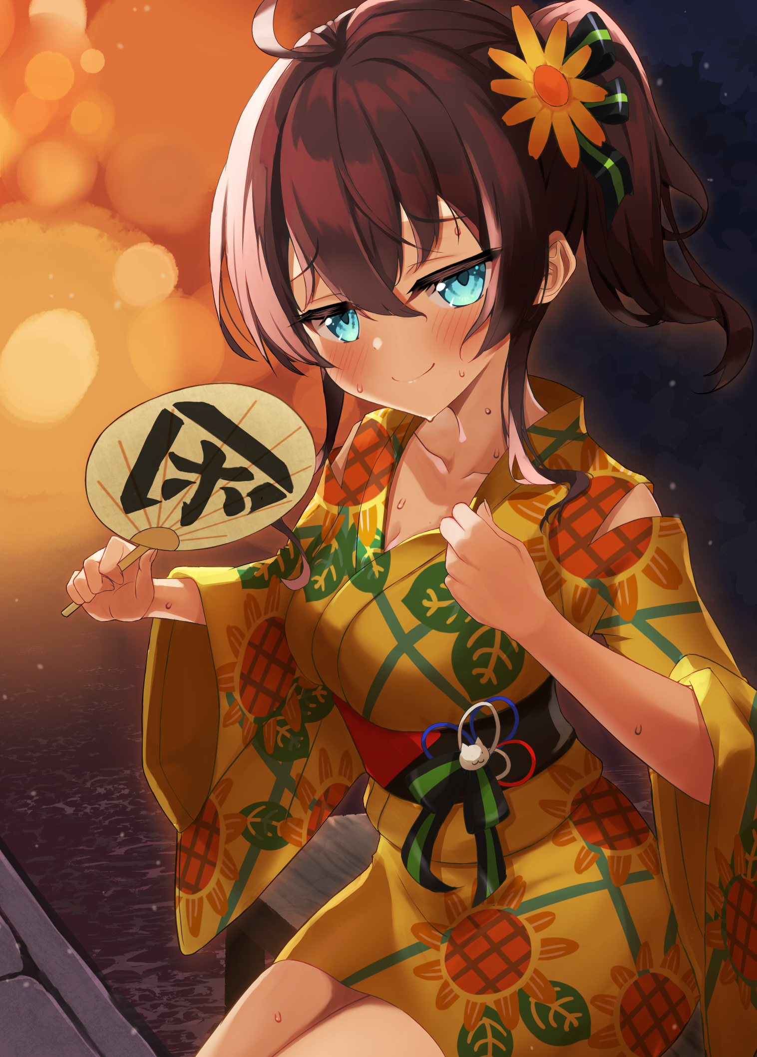 夏祭りに一緒に来て、ベンチで休憩しつつ「あっついね…」とうちわをパタパタしているシチュエーションを想定しました。夏祭り会場とは少し離れた場所のベンチで二人で休憩してる時、少し浴衣を緩めてパタパタしてたら鎖骨に目が行ってしまった、そのドキッと感を狙ってみました(ご本人はわざと見せている想定です)。