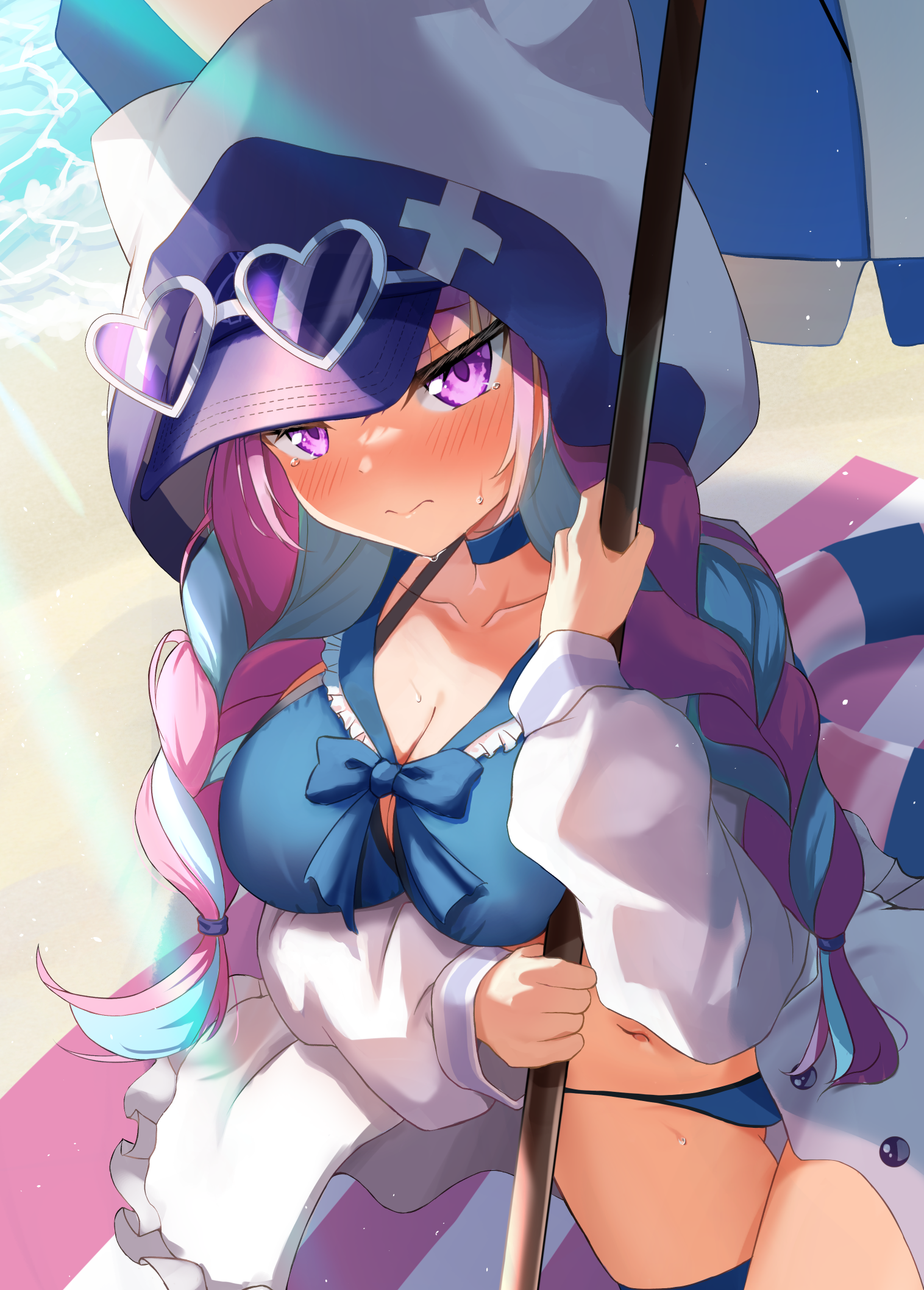 ビーチで大胆なビキニを着てみたものの、思ったより露出が多くて恥ずかしくなり、上着のパーカーで隠そうとしているシチュエーションを想定しました。隠そうとしても隠し切れないグラマーな体型にもこだわりました。手はぎゅっとパラソルを握ることで、緊張を表しています。