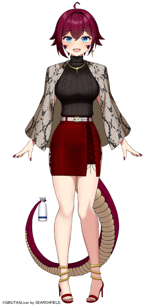 お酒が好きなヤマタノオロチの女の子です。ジャケットを蛇柄にしたり、各種アクセサリーを蛇モチーフにしたり、尻尾をつけたりなどヤマタノオロチ要素を多く盛り込みました。