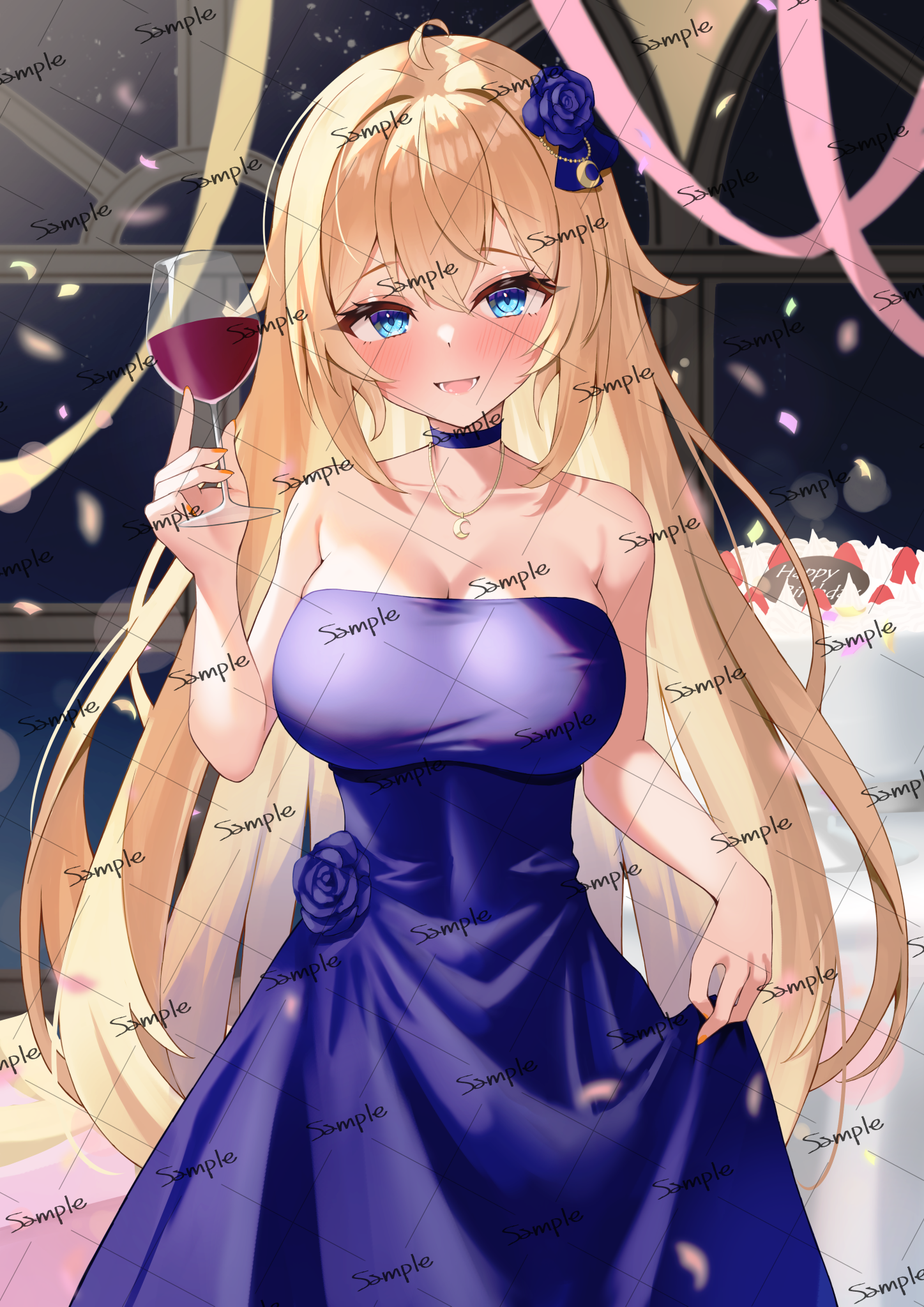 お酒好きなアイシェさんにワインを持たせ、誕生日ケーキやプレゼントボックスと合わせて誕生日会のような雰囲気が出るように描きました。 背景は夜にして、金髪が映えるように工夫しました。