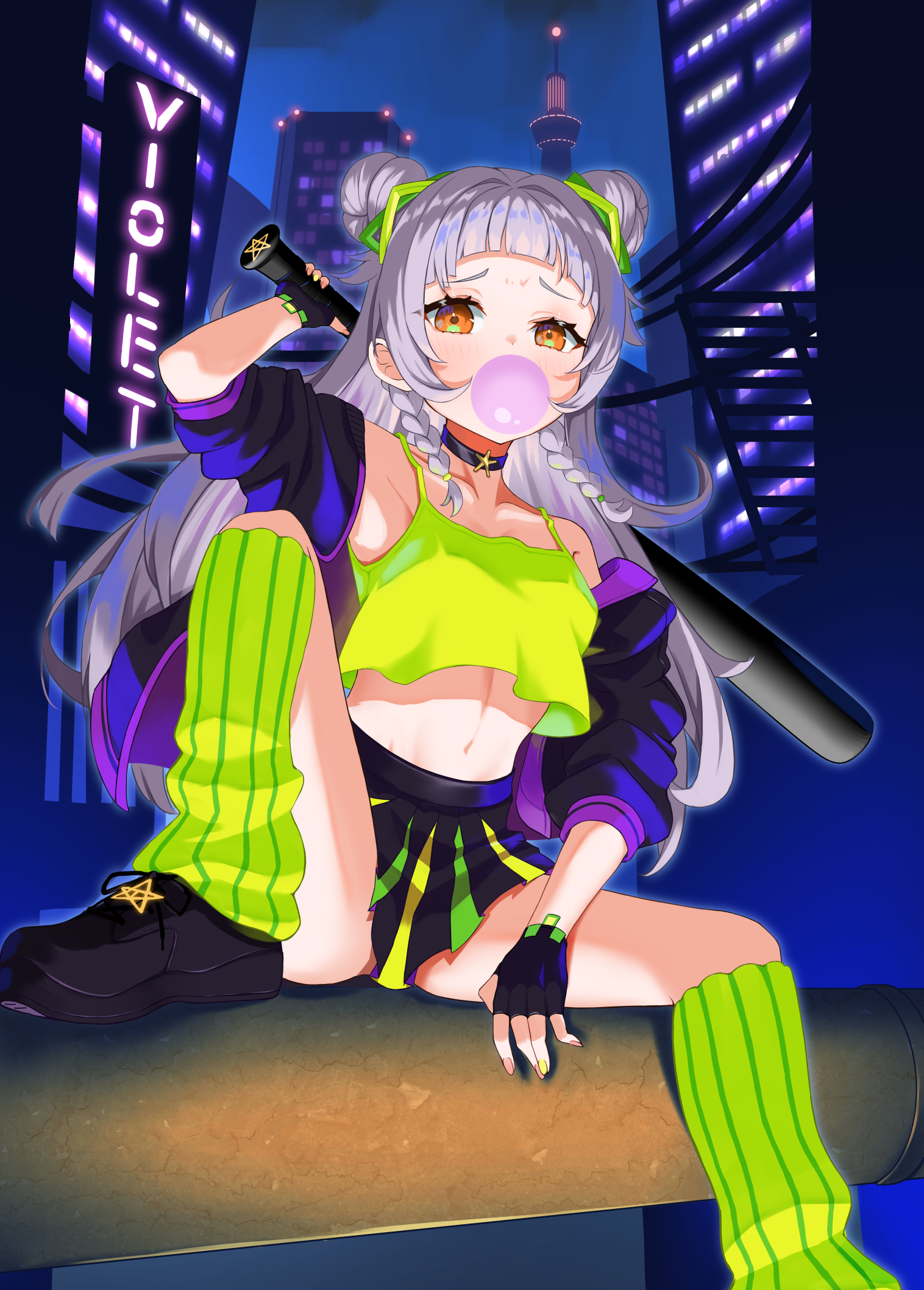 holo27で公開された衣装です。悪ガキ感、不良感を出すためにバットを持たせ、フーセンガムを膨らませました。また背景は、手前に裏町的な建物、後ろにビルを配置して、都会の治安の悪い場所に佇んでいる雰囲気を出してみました。