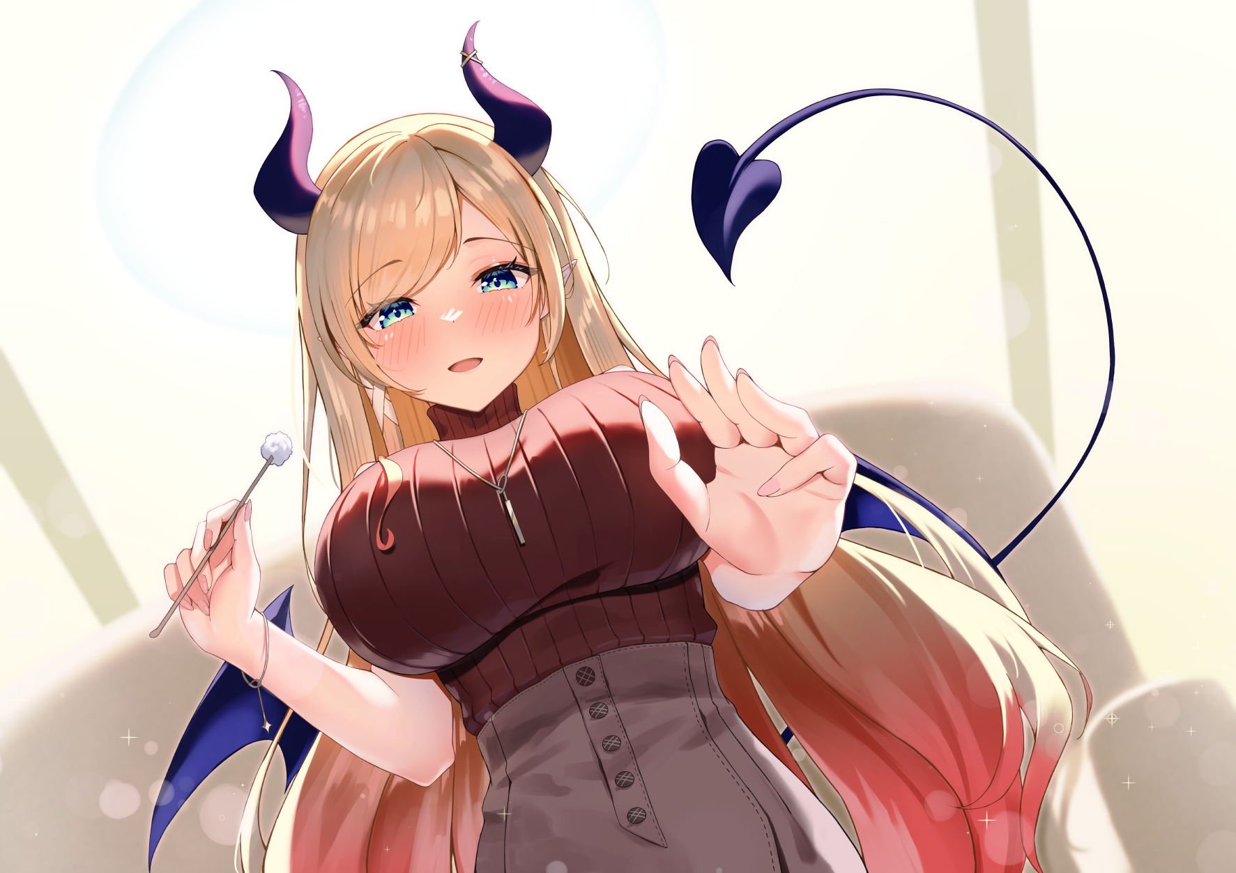 ちょこ先生といえばASMR!ということで、膝枕して頭をなでながら耳かきしてくれているシチュエーションを想定しました。膝枕の上から見える大きい胸と、優しい表情に注力して描いてみました。また左手を大きく描いて、前後感が出るように工夫しました。衣装は公式の「推しチョコ」キャンペーンにてnecomi先生が描かれていたものです。